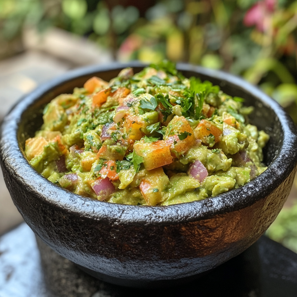 Ce guacamole revisité est parfait pour vos apéritifs ! Il peut être servi avec des chips de maïs, des crudités ou en accompagnement de plats comme les fajitas ou les salades estivales.