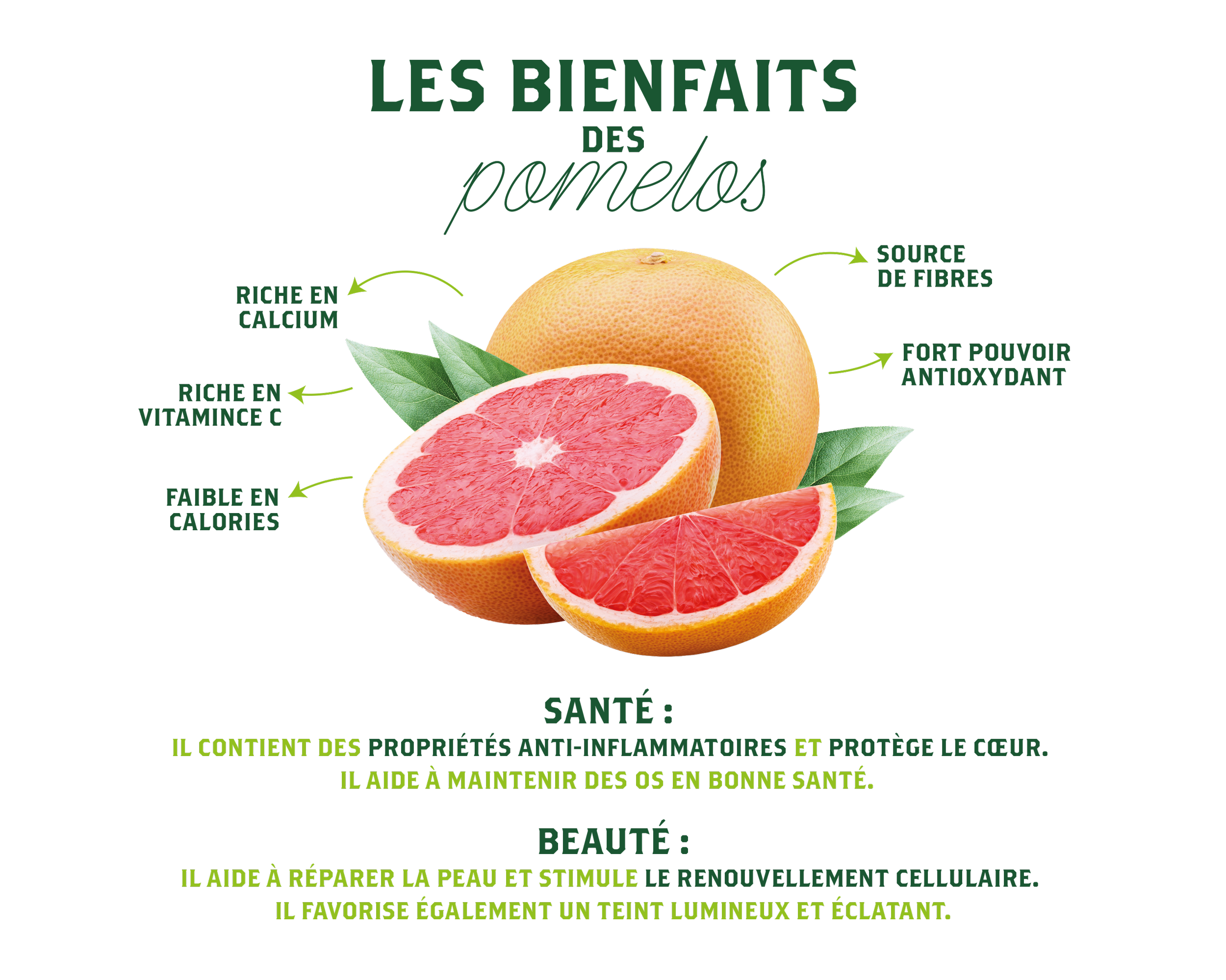 Le pomelo est riche en vitamines et minéraux, notamment en vitamine C, qui renforce le système immunitaire et favorise la santé de la peau. Avec environ 37 mg de vitamine C pour 100 g, il aide également à lutter contre les radicaux libres. En plus de ses propriétés antioxydantes, le pomelo est faible en calories et contient des fibres, favorisant ainsi une bonne digestion. Sa consommation régulière peut contribuer à une meilleure hydratation et à une sensation de satiété.